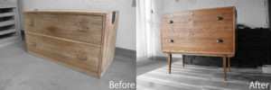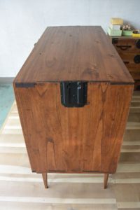 状態は悪く、材料は薄く、いたるところが干割れしていて、金具もサビサビ。不幸中の幸いとしては腐れや虫食いがほとんど無かったこと。ゆがみもほぼ無し。裏板は総交換しました。割れ、傷、隙間を直し、四本足のチェストにアレンジしました。塗装もアンティーク調に着色し、オイルフィニッシュしました。古材のむら感が際立って個人的には大変気に入っています。金具もアンティーク調なものに取り換えました。