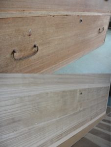おそらく元は三つ重ねの昇り箪笥であったであろう、他は処分されて中台だけが残っていた、処分寸前の総桐箪笥でした。可哀そうなので譲っていただき、展示品として再生することにしました。