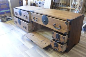 お客様は洋裁をしており、布生地や道具類を収められてインテリアにもなるようにと、数ある箪笥の中から比較的状態の良かったこの民芸箪笥をローボードにすることにしました。