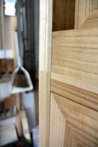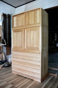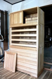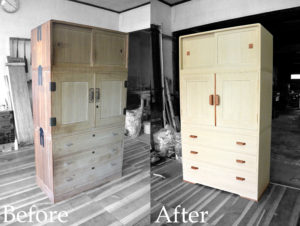 外蝶番を内蝶番に変えるということは、タイコ(ビフォーアフター2枚目の写真)を設けないとお盆がうまく引き出せません。古箪笥の再生内容はその都度違うので、毎回勉強になります。何よりも、再生された箪笥をみて驚くお客様の反応が嬉しく、有り難い限りです。