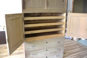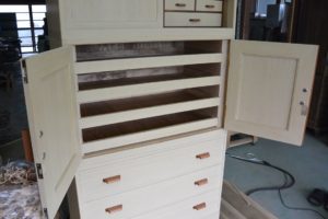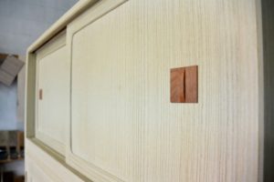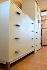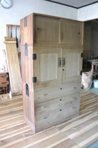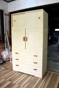 古箪笥の復元とアレンジです。 前記の新品桐チェストにデザインを合わせて再生させていただきました。同じように引手はサクラで自作し、二竿とで引出しや棚板のラインを合わせるようにしました。