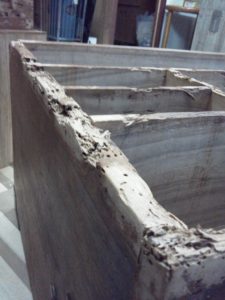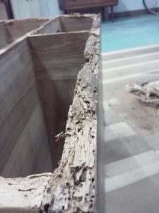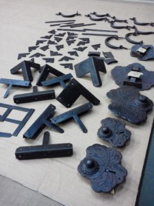 幸い金具はすべて揃っていて、状態も良く、再利用可能でした。また、本体の材も厚く、虫食いだらけではあるが剛性や直角は保たれていたので作業は比較的しやすかったです。