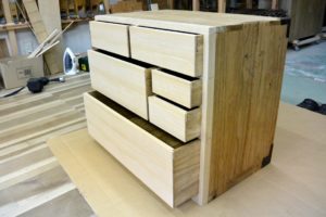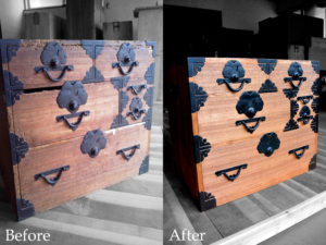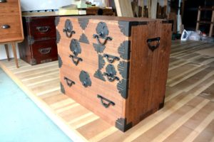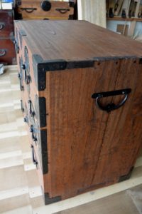 時代金具のたくさんついた桐の小箪笥です。全体にひどく虫食い跡がありました。この虫食いを全部キレイに直すと、ほとんど元材が無くなり、直すよりも作った方が安いし早い。ということをお客様に納得していただいた上で、主に前面だけキレイにして、引出しとして使用に耐えうる修理だけを施す。ということになりました。