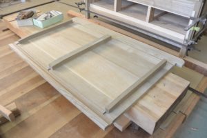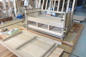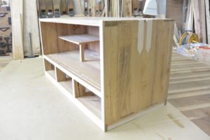 作られた年代は戦後間もないころで、材はさほど厚くなく、作りも華奢でした。ベンチソファに改造するには人間の体重が箪笥にかかるので、しっかりした材と作りの箪笥でないと不可能だと当初は思っていました。しかし、お客様の強いご希望に応えるべく、一から構造を考え直すことにしました。