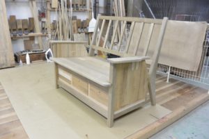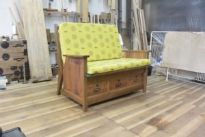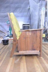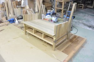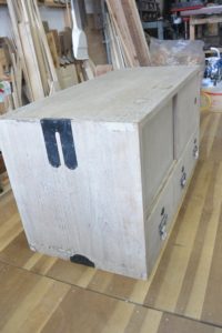 元は三つ重ねの三方桐のたんすでした。下二つは既に着物を入れて使われていたのですが、上台は使われずお婆様の思い出のあるものなので処分に困っていたそうです。そんな時縁あって当社を知り、ベンチソファに一目惚れされたそうです。