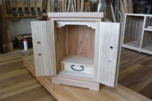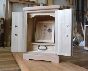 三方桐の三つ重ねの箪笥から厨子とネームプレート、金具からペンダントを作成しました。