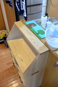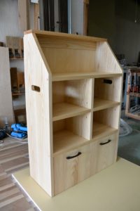 こちらはオーダー製作品の収納ラックです。材料はホワイトアッシュです。キッチンの脇にちょうど合うように高さや出っ張りなどを採寸して作りました。