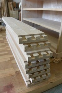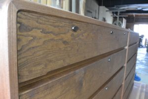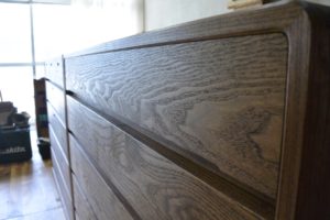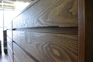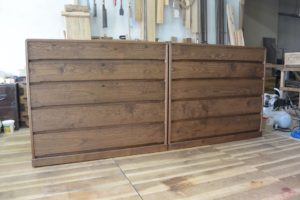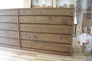 お客様のご要望は、取手は金具ではなく彫り込み引き手、一棹は三つ割りにして引き明け(鍵)付き。塗装は普段使いに適した茶系でオイルフィニッシュ。あと、高さが90cmくらい。