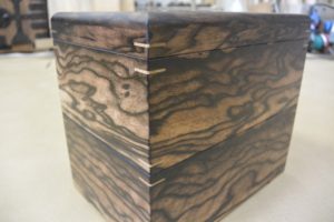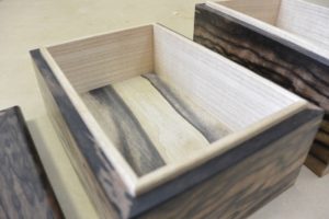 材料はお客様支給で、長らく板を持っていましたが、宝の持ち腐れで何かしら形にしたいということでご依頼頂きました。頂いた板は幅25センチ、長さ150センチほどのものが2枚。しかし腐れなどがあり使える部分は正味一枚分でしたので小箱となりました。